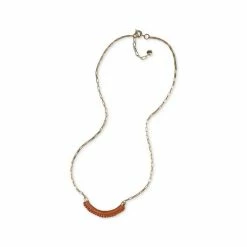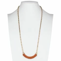 Rich full-grain leather is fabulously wrapped around the crescent-shaped pendant of this long Patricia Nash necklace.