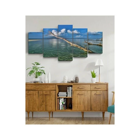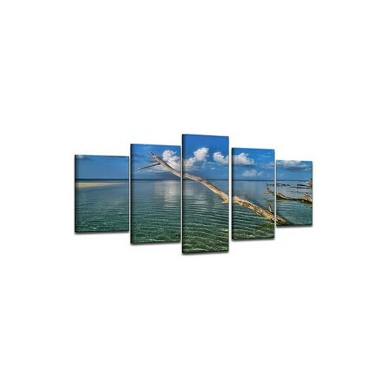The grand bahama 5 piece canvas art set depicts a horizon of a clear blue sky lightly brushed with clouds, against an open sea with branches rising from the sand. Bring the beauty of nature to your decor with this stunning wall art.