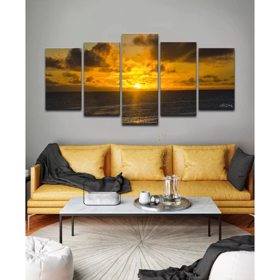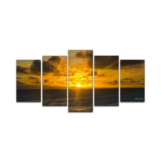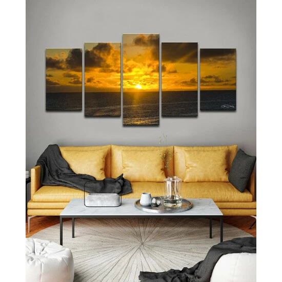The niue sunset 5 piece canvas art set depicts a horizon with bursts of orange flares if light by a settling sun. Bring the beauty of nature to your decor with this stunning wall art.