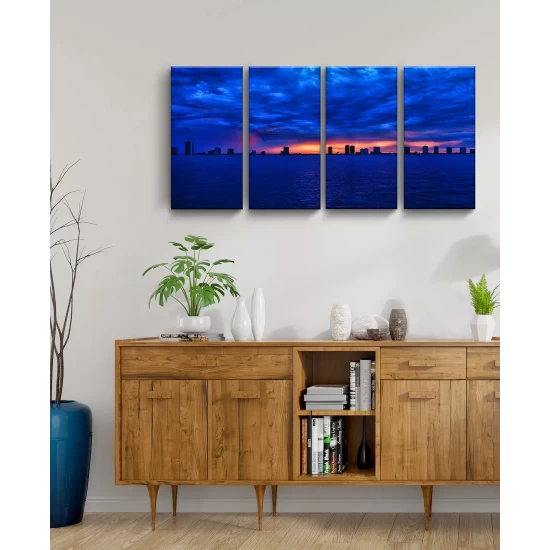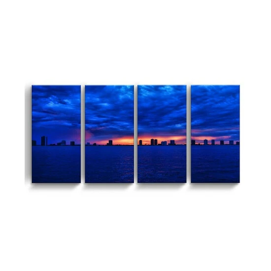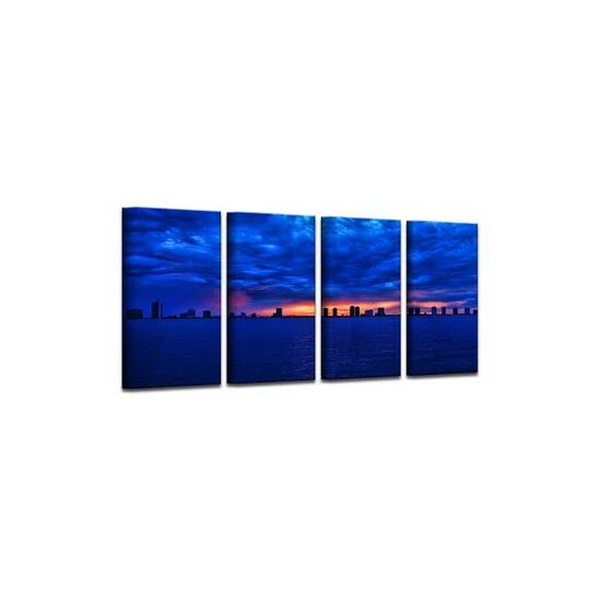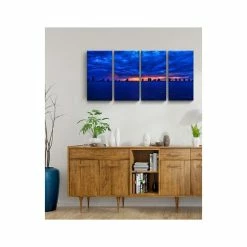 The singer skyline 4 piece canvas art set depicts a royal blue horizon with streaks of light bursting through the sky. Bring the beauty of nature to your decor with this stunning wall art.