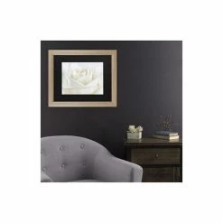 This ready to hang, matted framed art piece features the delicately overlapping petals of a white rose. A clear acrylic facing is added to protect the print. The piece is fully assembled by professional framers.