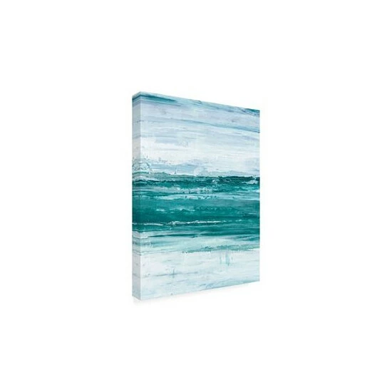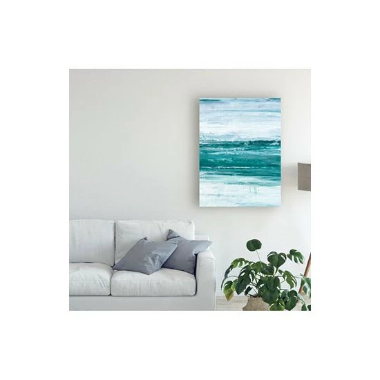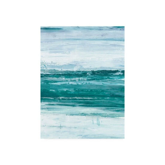 This ready to hang, gallery-wrapped art piece features horizontal strips of pale blue and deep teal paint. Gallery-wrap is a method of wrapping an artist’s canvas around a hidden, wooden frame allowing for a frameless presentation.