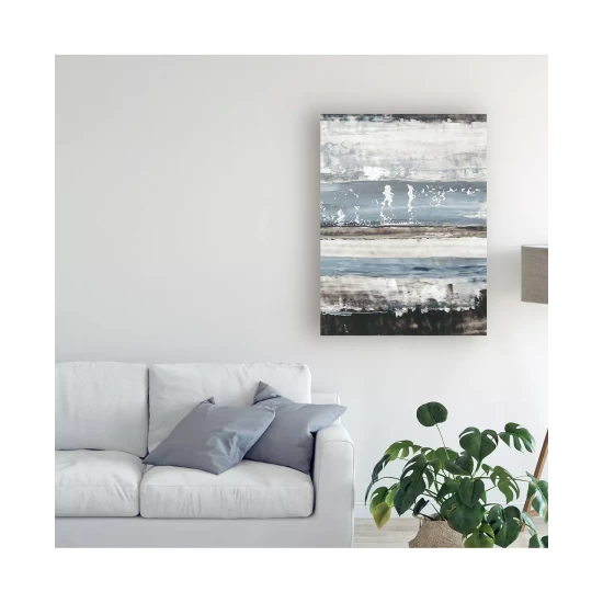 This ready to hang, gallery-wrapped art piece features a gray and white abstract composition. Gallery-wrap is a method of wrapping an artist’s canvas around a hidden, wooden frame allowing for a frameless presentation.