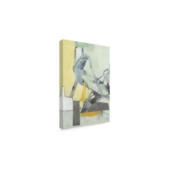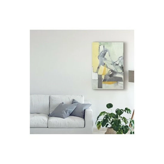 This ready to hang, gallery-wrapped art piece features a yellow and gray abstract shape pattern. Gallery-wrap is a method of wrapping an artist’s canvas around a hidden, wooden frame allowing for a frameless presentation.