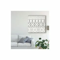 This ready to hang, gallery-wrapped art piece features a white leaf pattern over gray. Gallery-wrap is a method of wrapping an artist’s canvas around a hidden, wooden frame allowing for a frameless presentation.