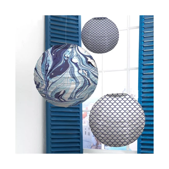Three very contemporary patterns—including a swirly marble look—highlight an unbeatable white-and-blue trio. The largest measures a whopping 20 inches around! To really go for the glow, tuck in battery-operated LED lights. Easy to assemble.