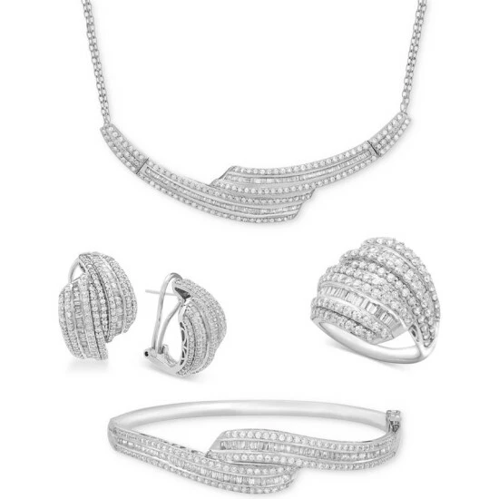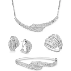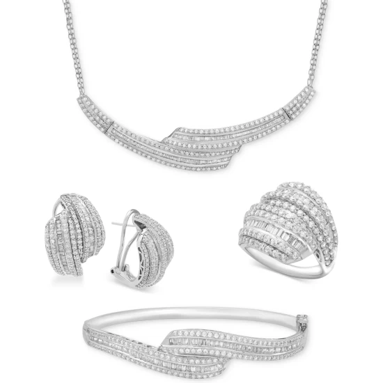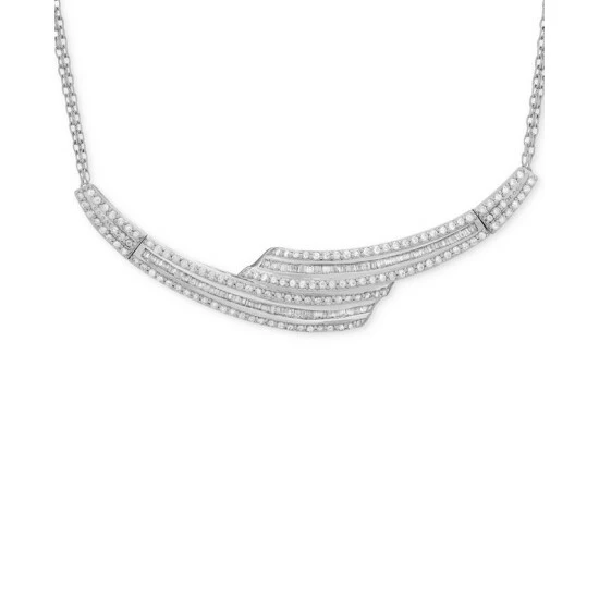 Shimmering rows of round-shape and baguette diamonds are expertly set for extravagant sparkle in this Wrapped in Loveโข collar necklace (2 ct. t.w.) designed in sterling silver. Bizmark chain with lobster clasp. Approximate length: 14-3/4″. Approximate drop: 1/2″.